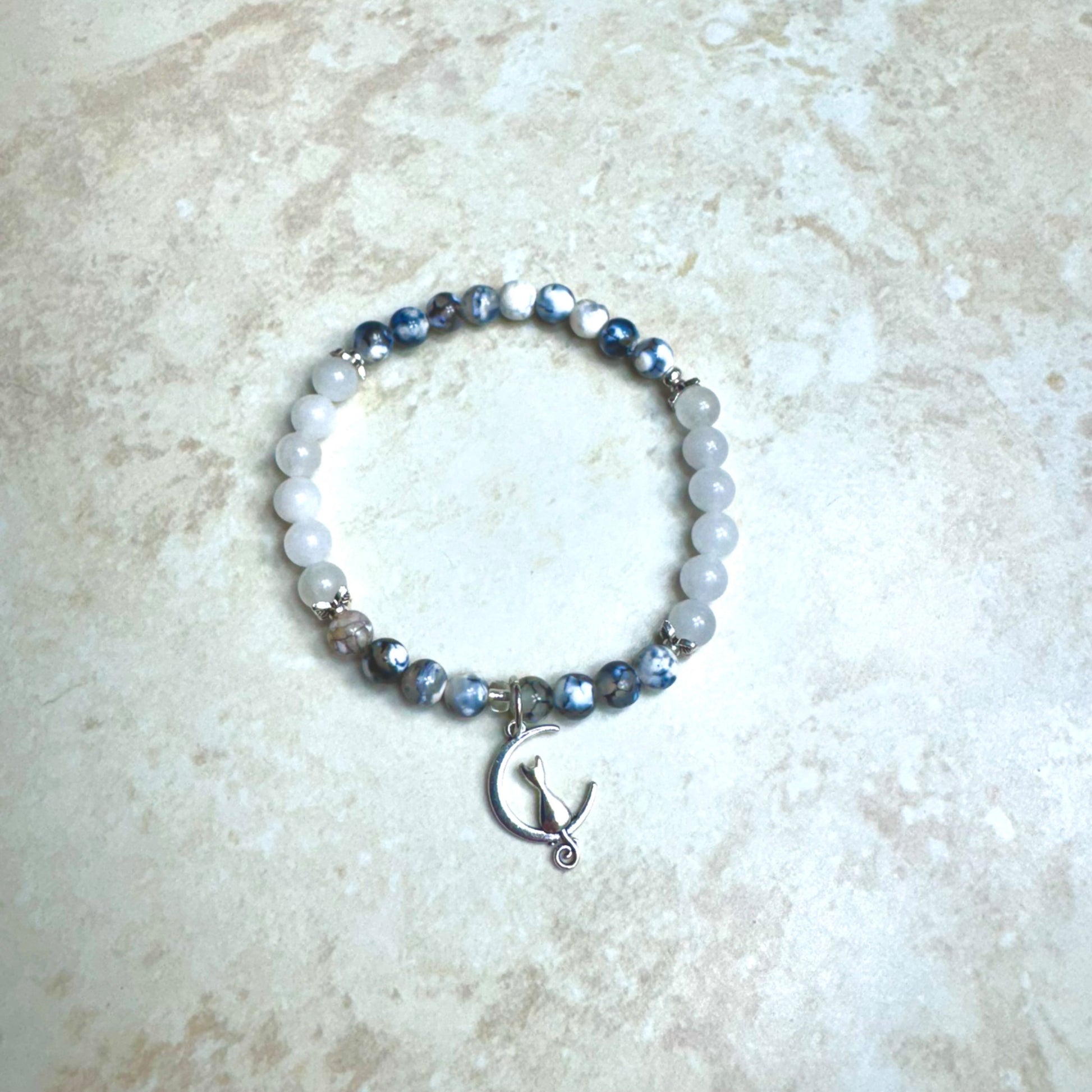 6.75" Fire Agate & Quartz Bracelet w/ Moon Kitty Charm