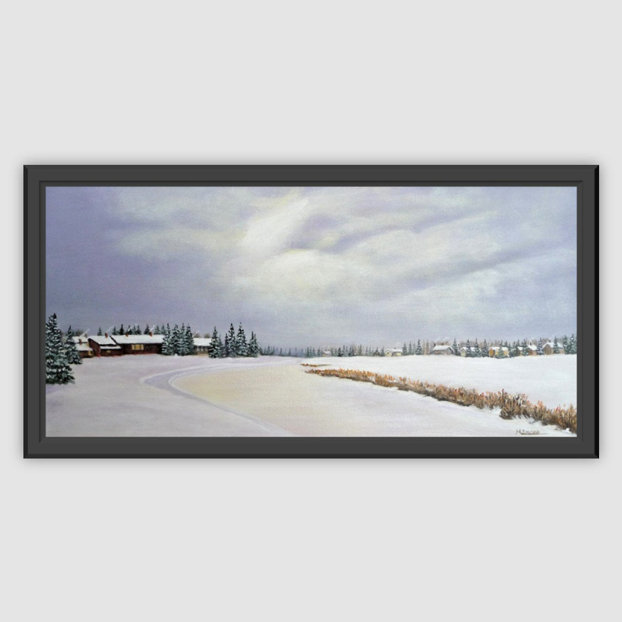 Original acrylic on canvas painting. Size is 14" x 26" including the dark brown floater frame.