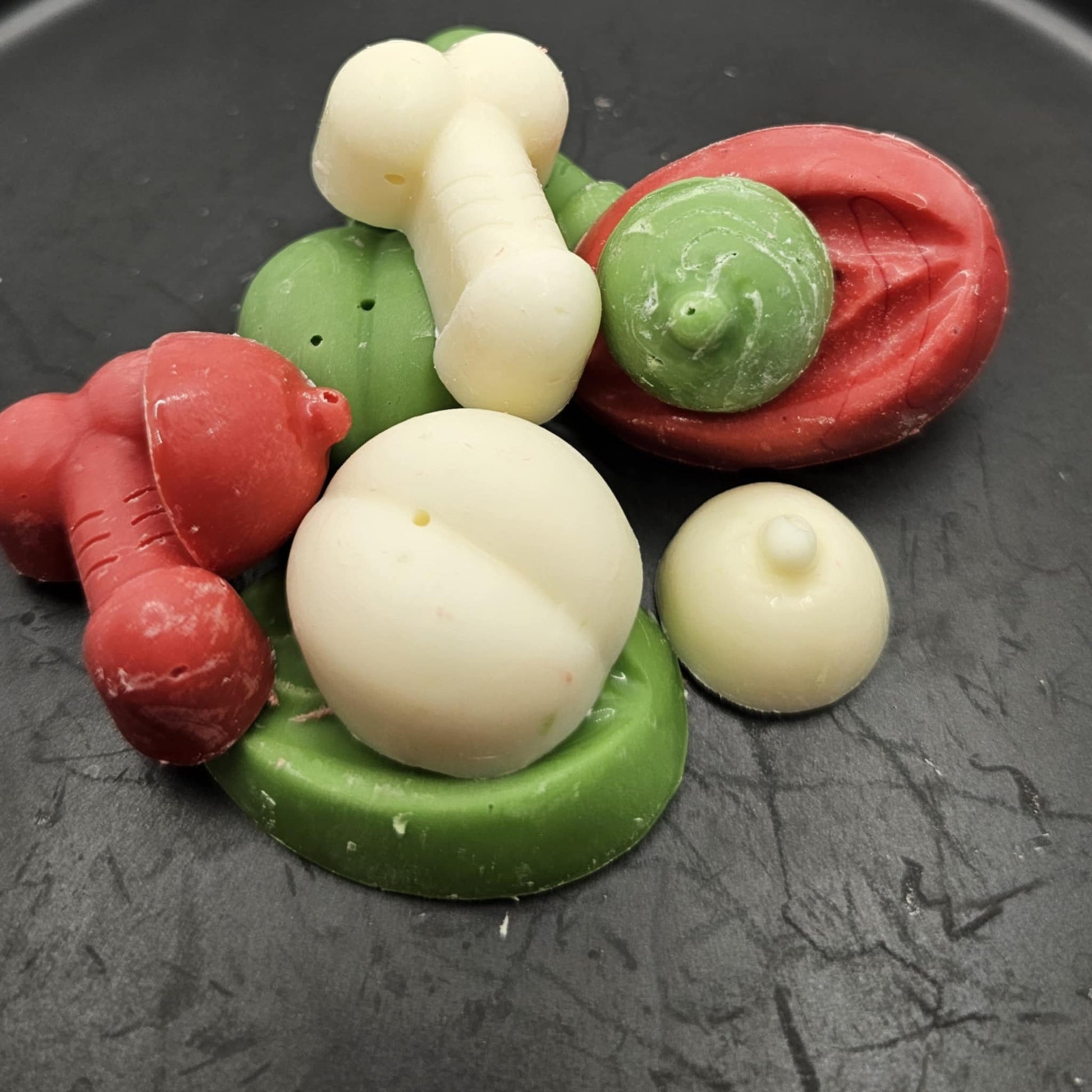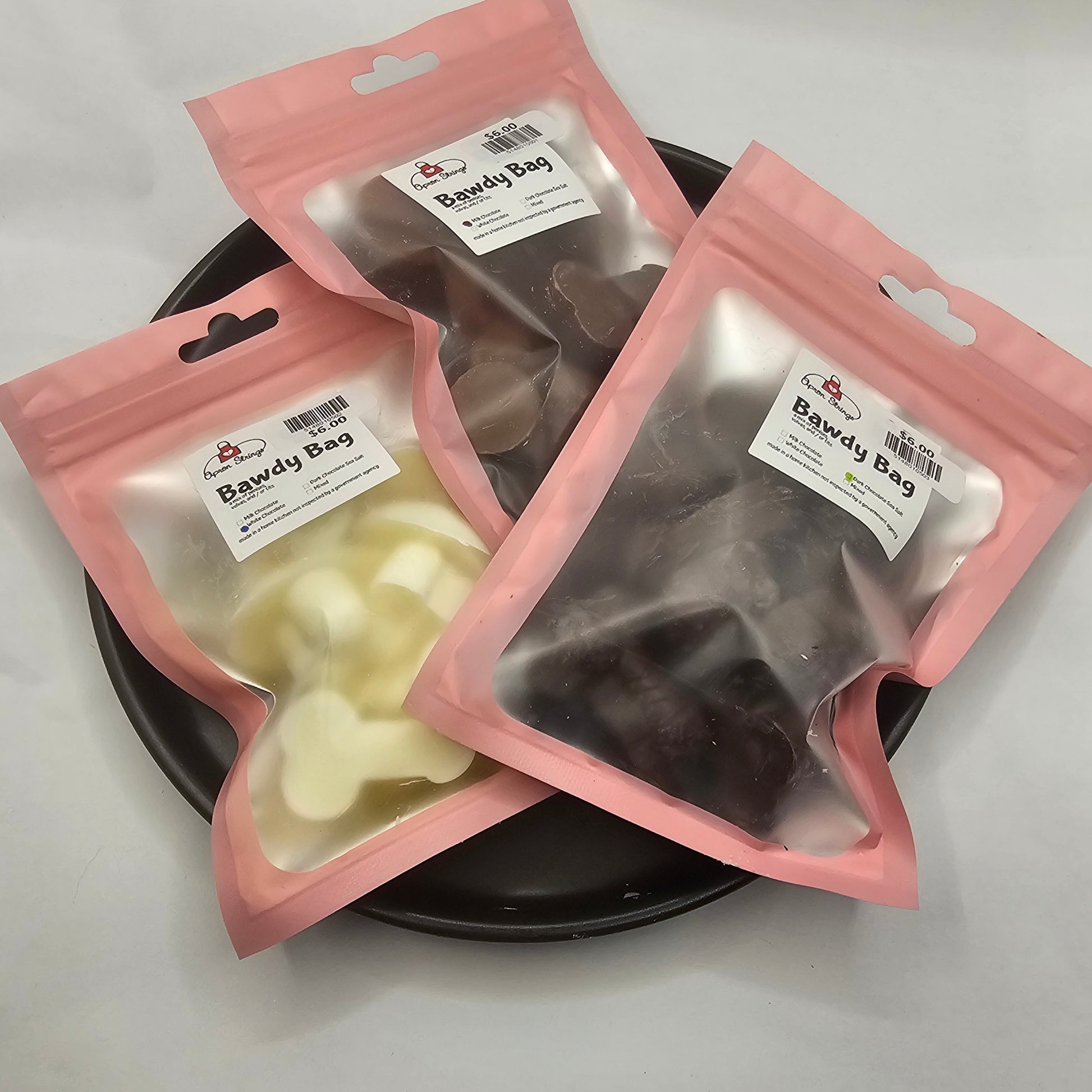 A bag of bawdy chocolates made from rich milk, white, or dark chocolate. Each bag contains a mix of dicks, twats, tits, and asses.