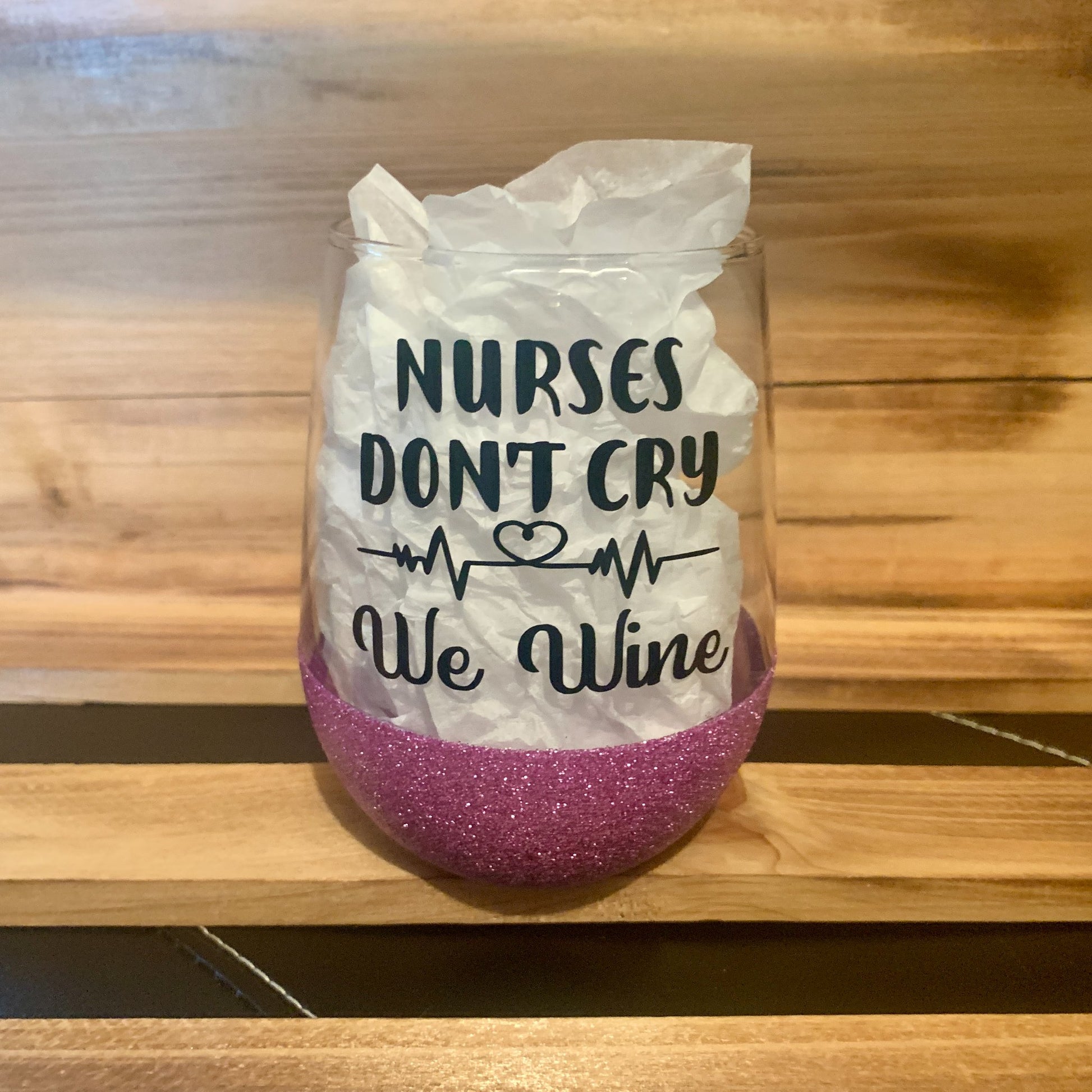 Enjoy a touch of glamour with our Nurses dont cry Stemless wine glass. With a 17oz capacity and glitter accent at the bottom, this glass is perfect for sipping your favorite wine. Hand wash only to preserve its stunning design. Raise a glass to kindness and elegance.