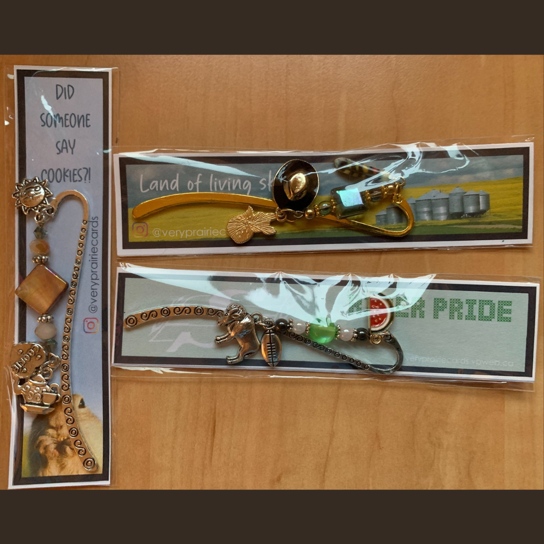 Beaded metal alloy bookmarks are dressed up with an assortment of charms. Each comes packaged with a photo backing bearing a quote or message (which can be used as a second bookmark).