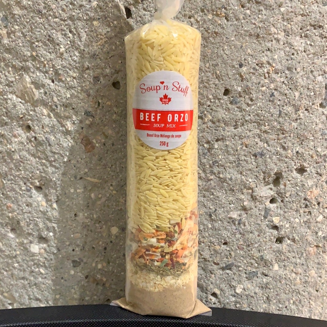 orzo, beef base (salt, dextrose, corn syrup solids, palm oil, hydrolyzed plant proteins (soya), corn starch, yeast extract (soy), dried onion, colour, silicon dioxide, spices, spice extracts, disodium inosinate, disodium guanylate.), dried onion, dried vegetable blend (carrot, potato, onion, leeks, red and green bell peppers, celery, cabbage), sulphite, thyme, oregano, red pepper |