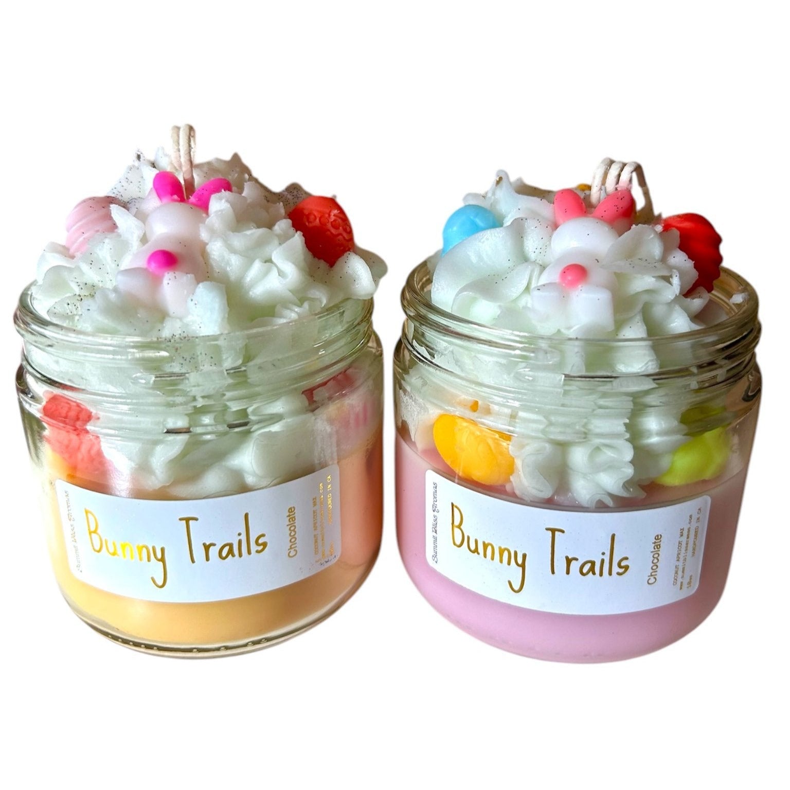 Bunny Trails medium with Embeds 10oz, medium whipped wax with empeds 10oz, & large with whipped wax 15oz) and a rich chocolate scent is a decadent, mouthwatering treat for the senses. The soft, fluffy whipped wax resembles a cloud of creamy frosting, inviting you to indulge in its sweet, warm embrace. The fragrance captures the irresistible allure of smooth, melted chocolate with subtle hints of vanilla, creating the perfect blend of rich sweetness. As it burns, the chocolate aroma fills your space, evoking the joy of Easter candy and the excitement of discovering hidden chocolate eggs. This candle adds a touch of sweetness and whimsy to your home, making it the perfect way to celebrate the season.