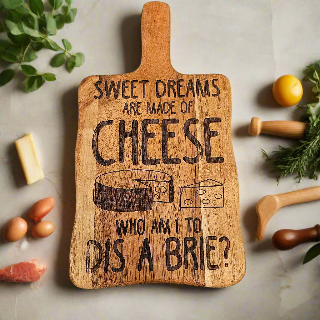 Get ready to serve up some laughs with our Cheese Boards! These boards don't just hold your delicious cheese, but also come with funny sayings that will surely add some fun to any gathering. Don't just platter, make it a party with our quirky boards!
