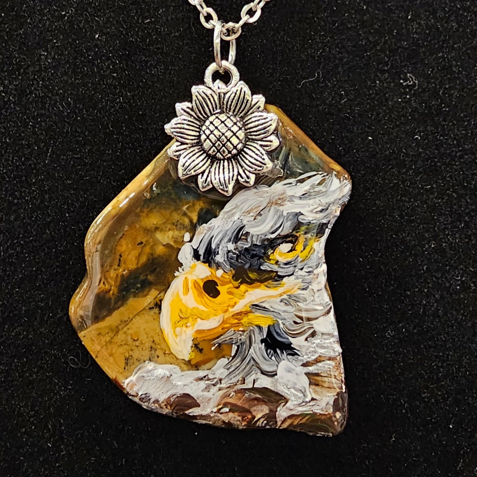 Necklaces are hand painted with acrylics on a variety of stone slabs and coated with resin. Majority of stones are agate with the occasional quartz, jasper, amethyst, and labradorite. Necklace lengths are 20", non-adjustable, and made from sterling silver.