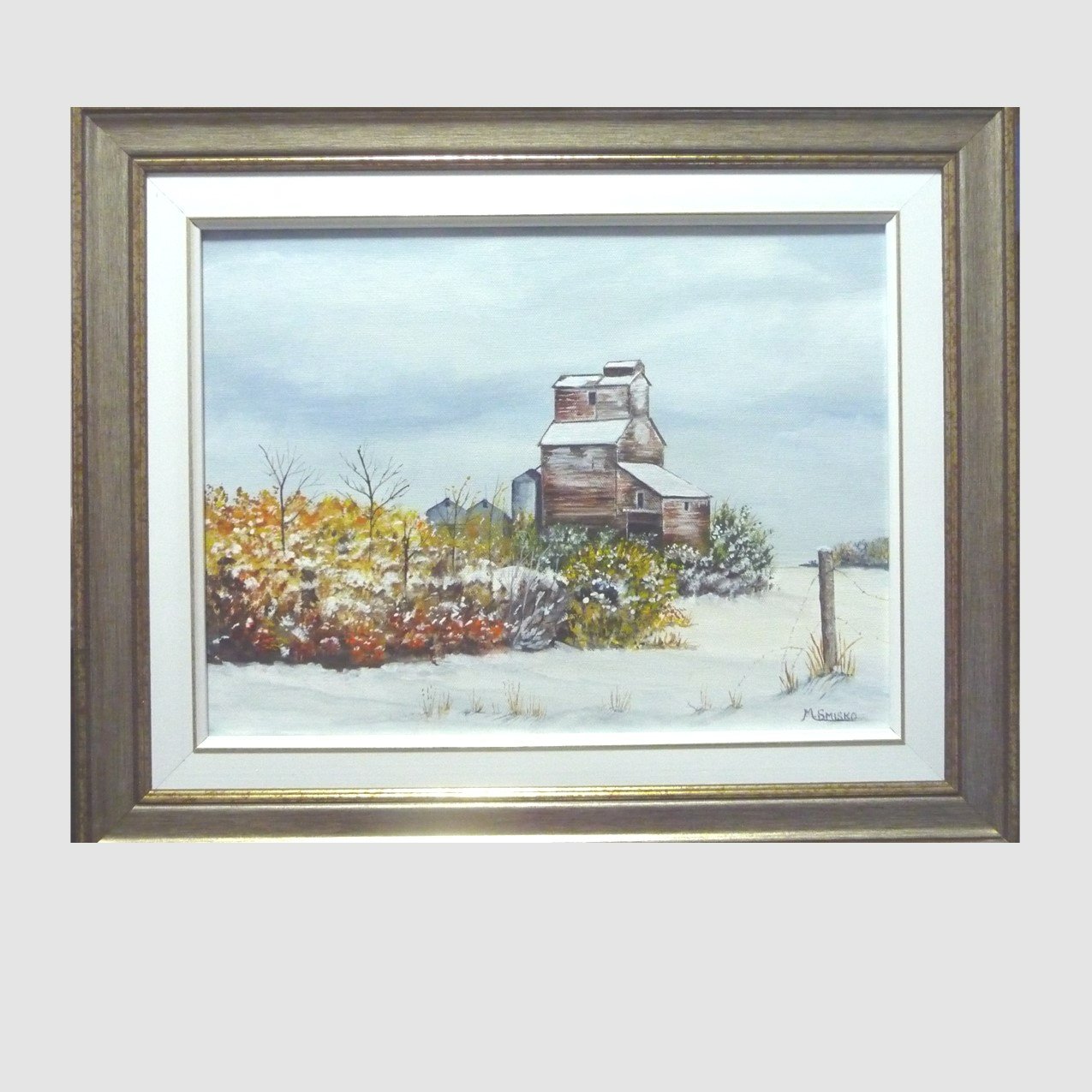 Early Saskatchewan winter scene features an old faded red grain elevator against a blue and somewhat cloudy sky on a mid-October day. Fall bushes full of wet fluffy snow and a single fence post off to the side behind more snow in the foreground complete the picture.