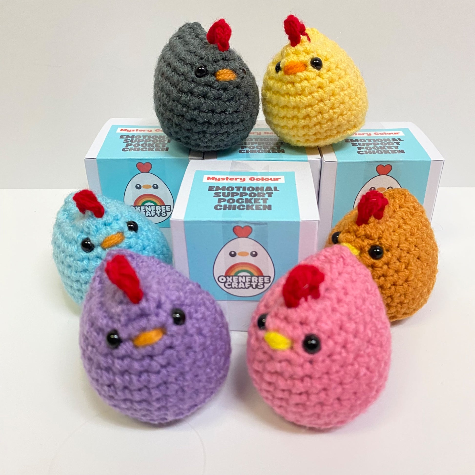 Each box contains one pocket-size Emotional Support Chicken, from a wide range of potential colours. These little chickens are approximately 2" tall, fitting perfectly in your palm or pocket - ready to be hugged, squeezed as a stress ball, or thrown at life's problems.