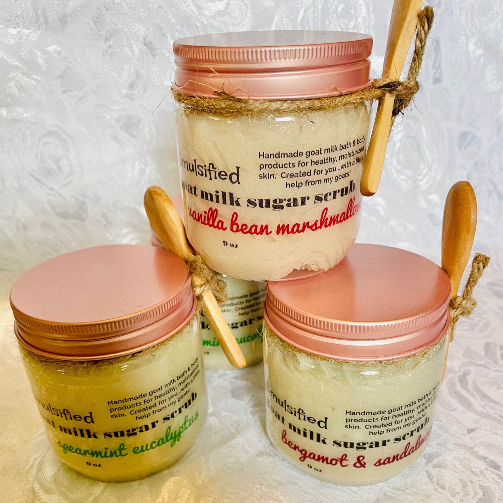 This creamy goat milk sugar scrub will leave your skin soft, smooth, clean and moisturized. It’s a sugar scrub, soap and moisturizer all in one! Great for softening rough, dry skin areas on your elbows and feet.