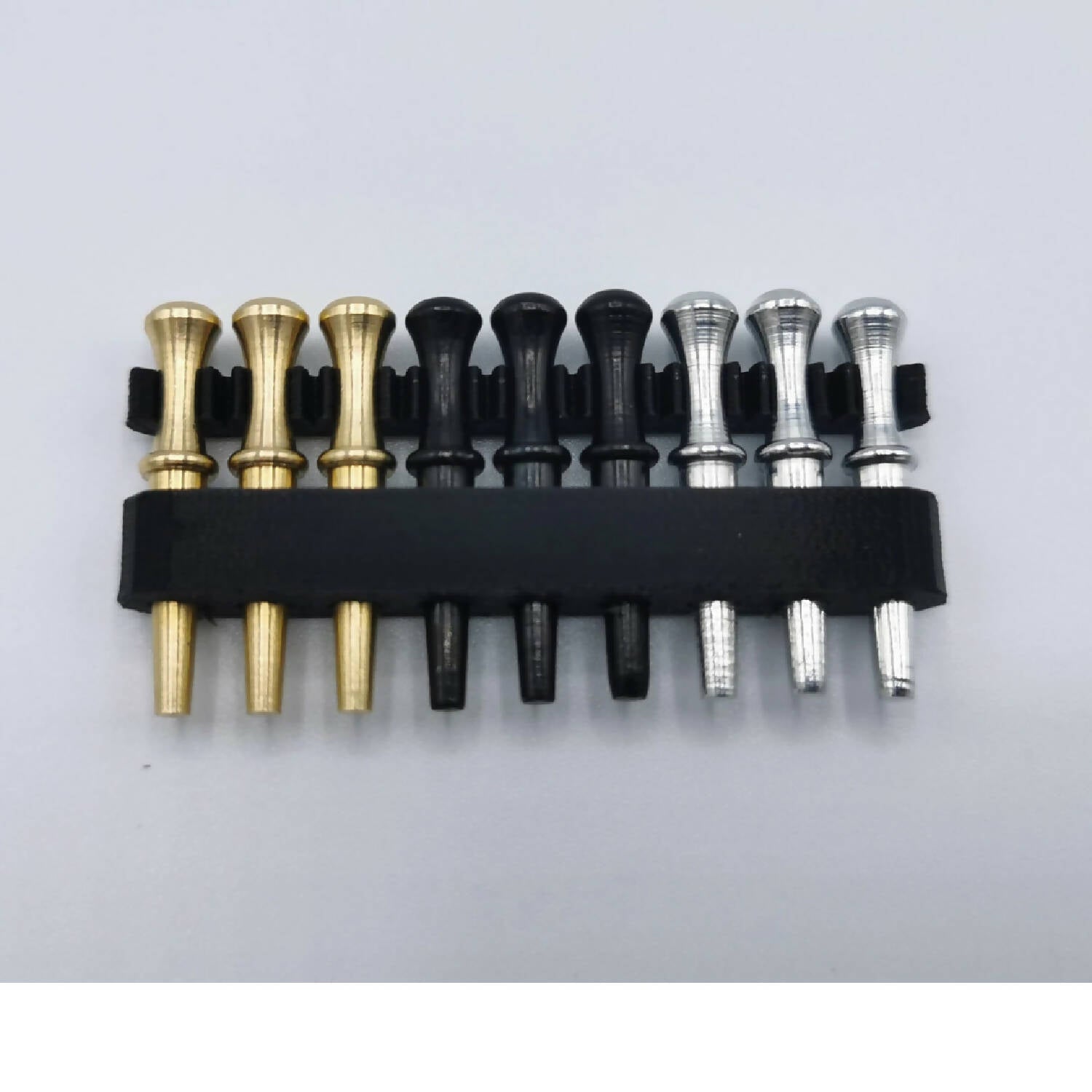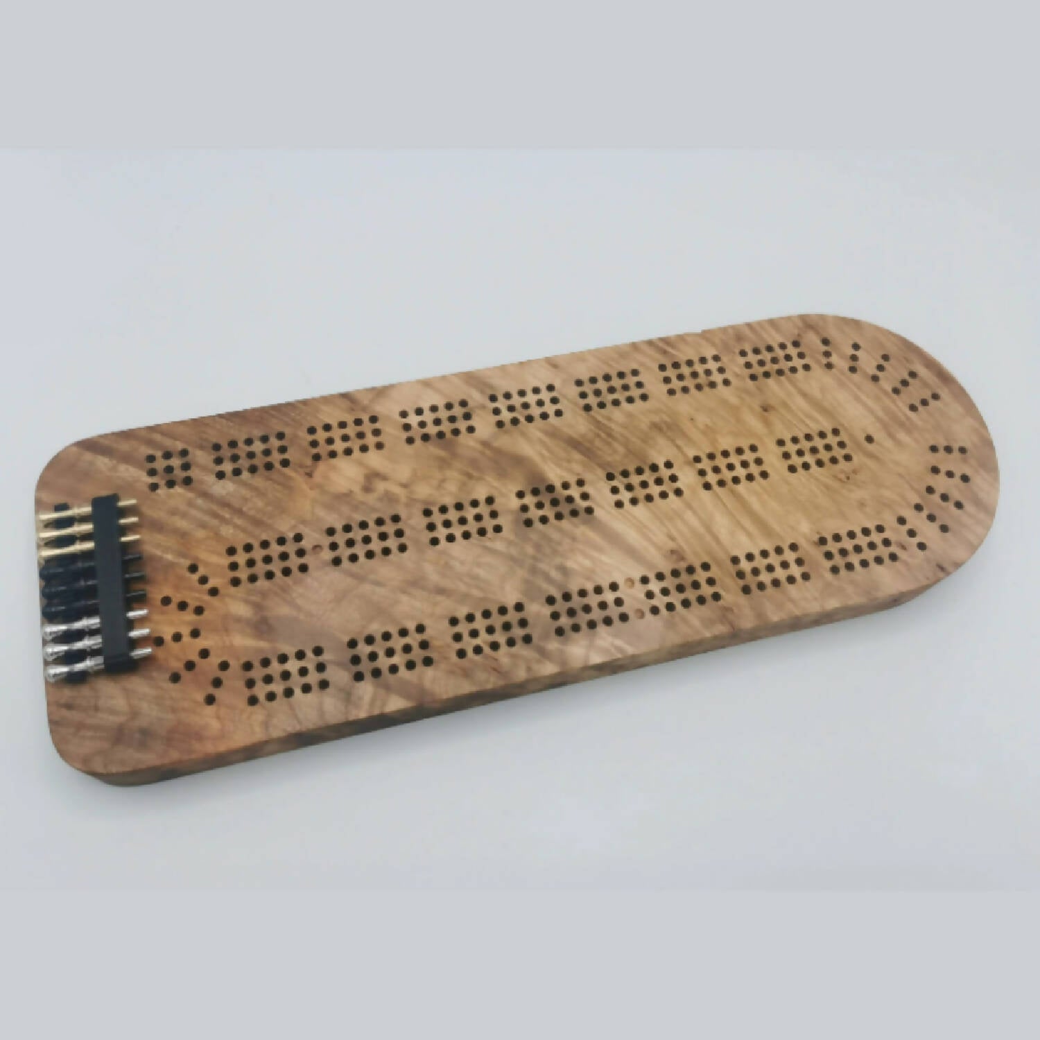 These boards are made with extremely figured Western Canadian burl . They measure 4”x12” and the holes are drilled to 1/8”. Includes a set of 6 precision machined metal cribbage pegs. We include a custom designed holder which keeps the pegs secure between uses. The pegs measure 29mm tall and are tapered to fit a 1/8" hole.