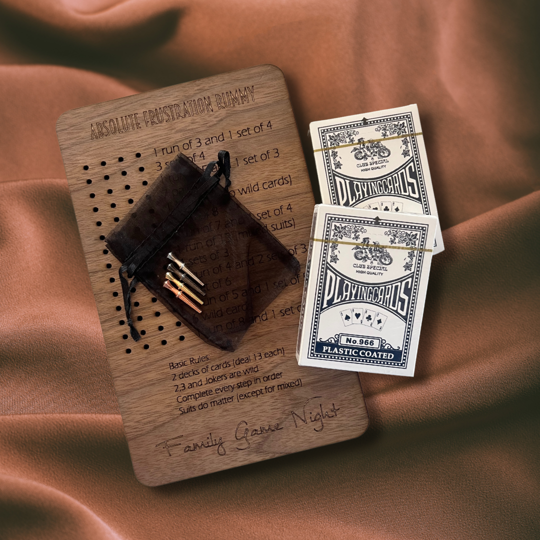 Get ready for a fun-filled evening with this beautifully handcrafted Frustration Rummy Game! Made from premium walnut, the 5.5" x 10" board is perfect for this classic card game that’s full of excitement, strategy, and fun. It’s a perfect addition to your family game nights, parties, or as a thoughtful gift for game enthusiasts. The set includes everything you need—cards, pegs, and easy-to-follow instructions!