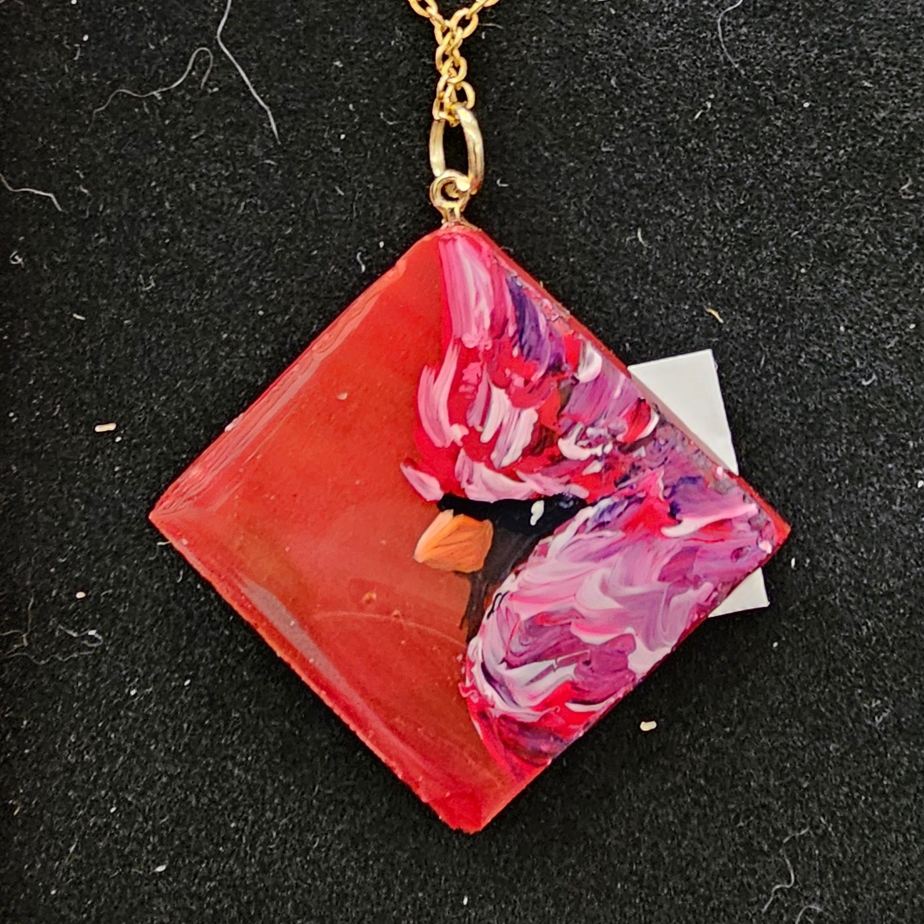 Necklaces are hand painted with acrylics onto stained glass and coated with resin. Ocean-themed necklaces often include real starfish and seashells. Necklace lengths are 20", non-adjustable, and made from sterling silver