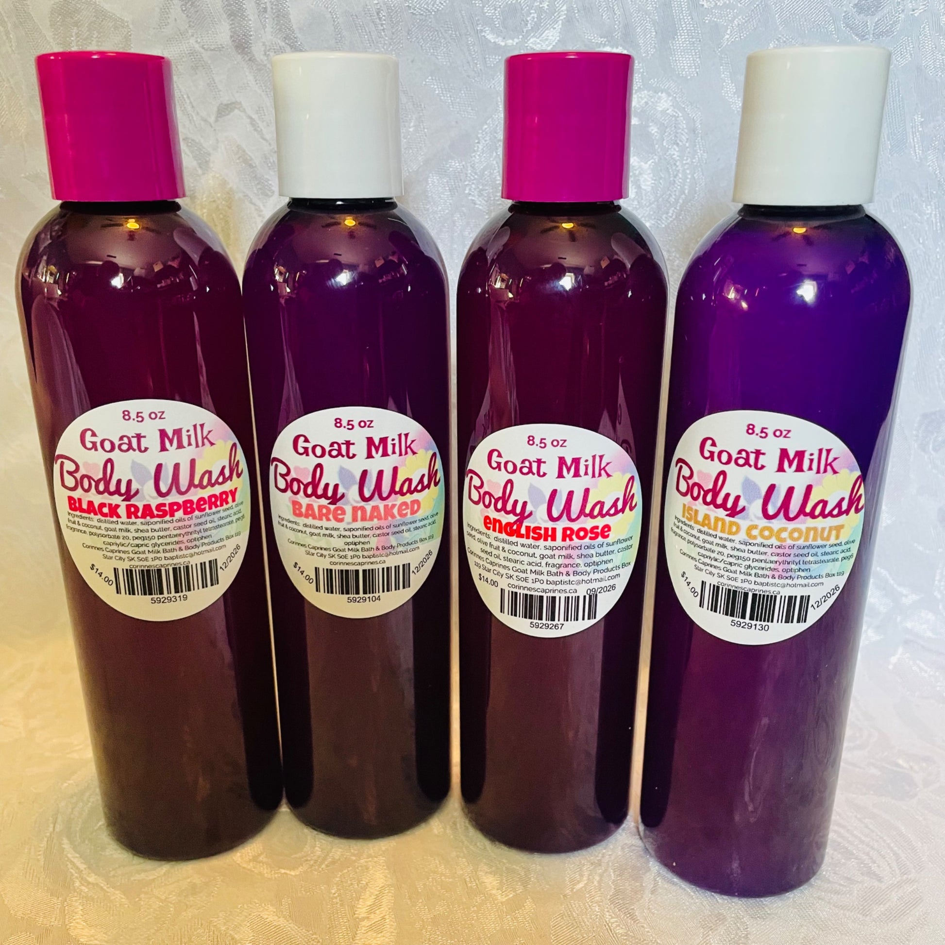 Ingredients: Distilled water, saponified oils of sunflower seed, olive fruit and coconut, goat milk, saponified Shea butter and castor seed oil, stearic acid, fragrance or essential oil as indicated, optiphen