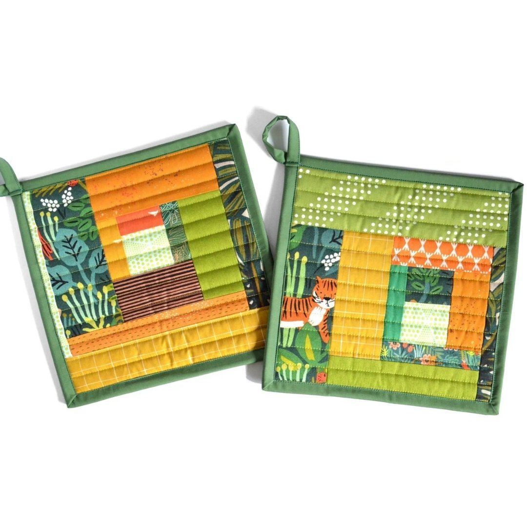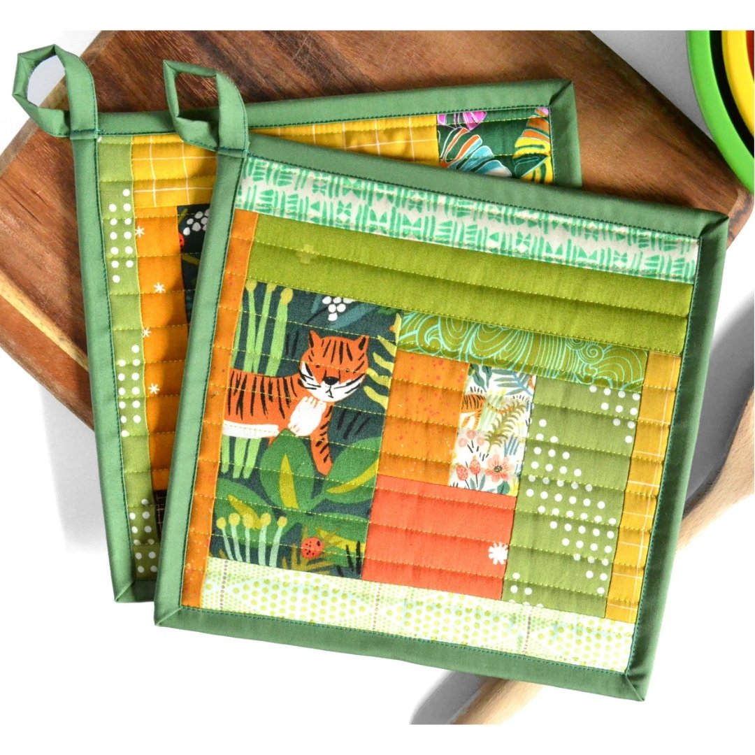 These quilted potholder sets feature a beautiful mix of designer cotton fabrics, which are sure to make a stand-out appearance in your kitchen! Made with two inner layers of all-natural cotton quilt batting able to resist high-heat temperatures, they’ll not only make a bright, modern addition to your kitchen, but also a practical one as well. Not only do these potholders make the perfect gift for moms, grandmas, hostesses, and cooks, they are also each 100% unique! Their patchwork-nature means that no two potholders are ever sewn together exactly the same, making each one truly a one-of-a-kind piece!
