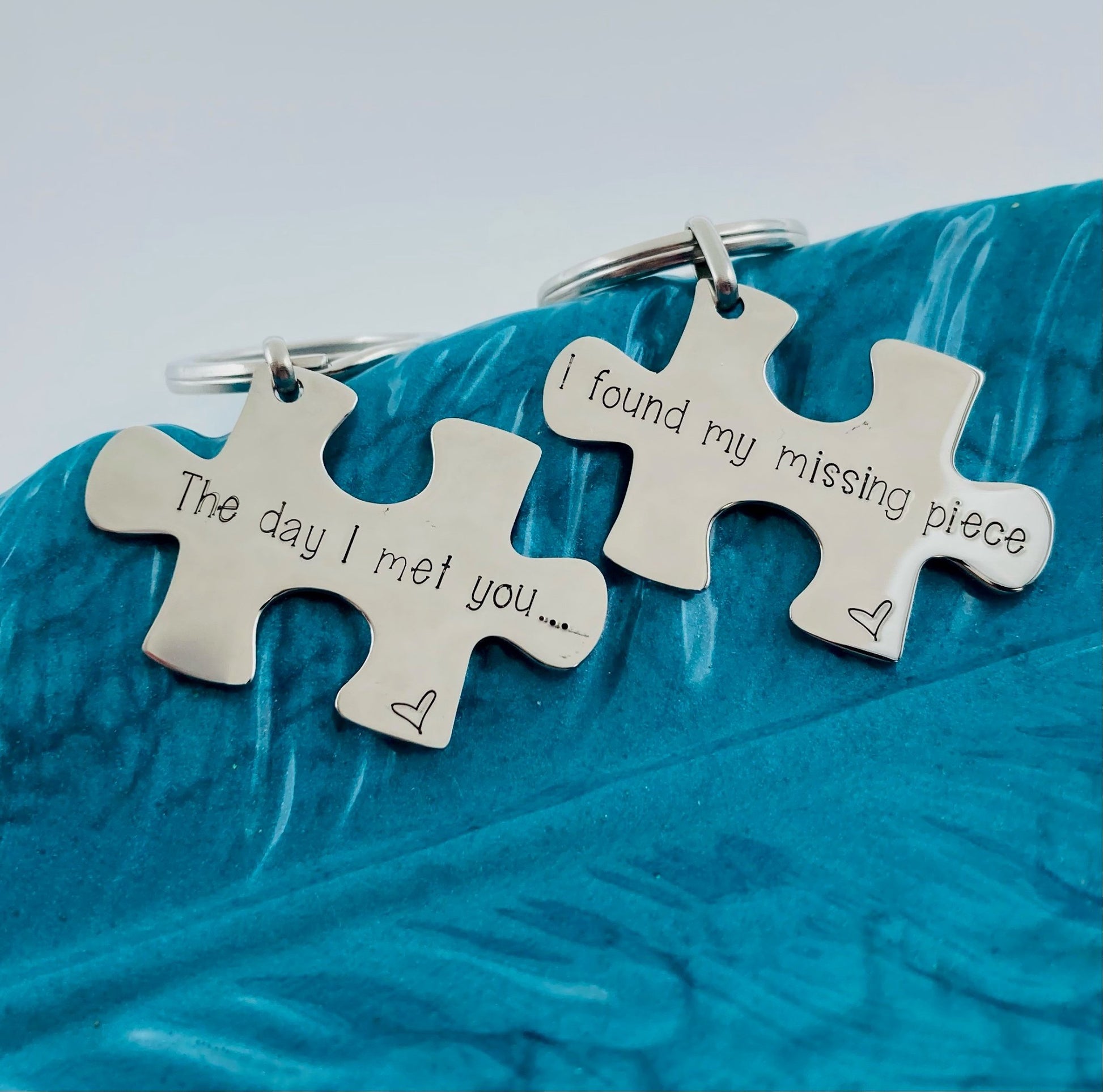 The stainless steel puzzle piece measures approximately 1" wide by 1 3/4" long. A heavy gauge connector and a stainless steel keyring complete the item. Sold as a pair.