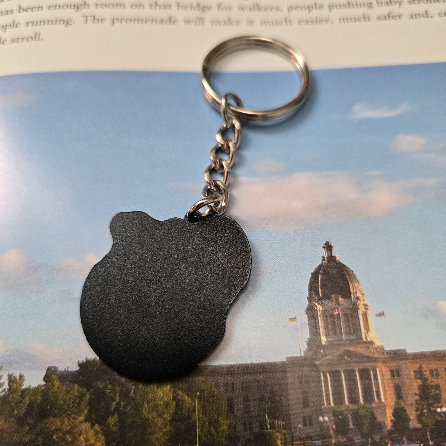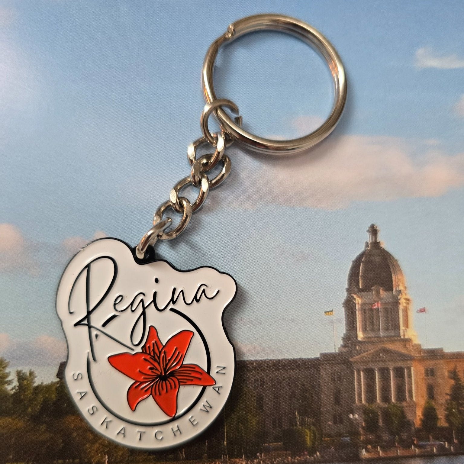 Regina, Saskatchewan enamel keychain. Great addition to any keychain or use as a zipper pull. A nice souvenir or gift of our great city. Lightweight (.6oz/15g) (pendant is 1.5"h x 1.5"w) Total length with pendant and chain is 3.5".