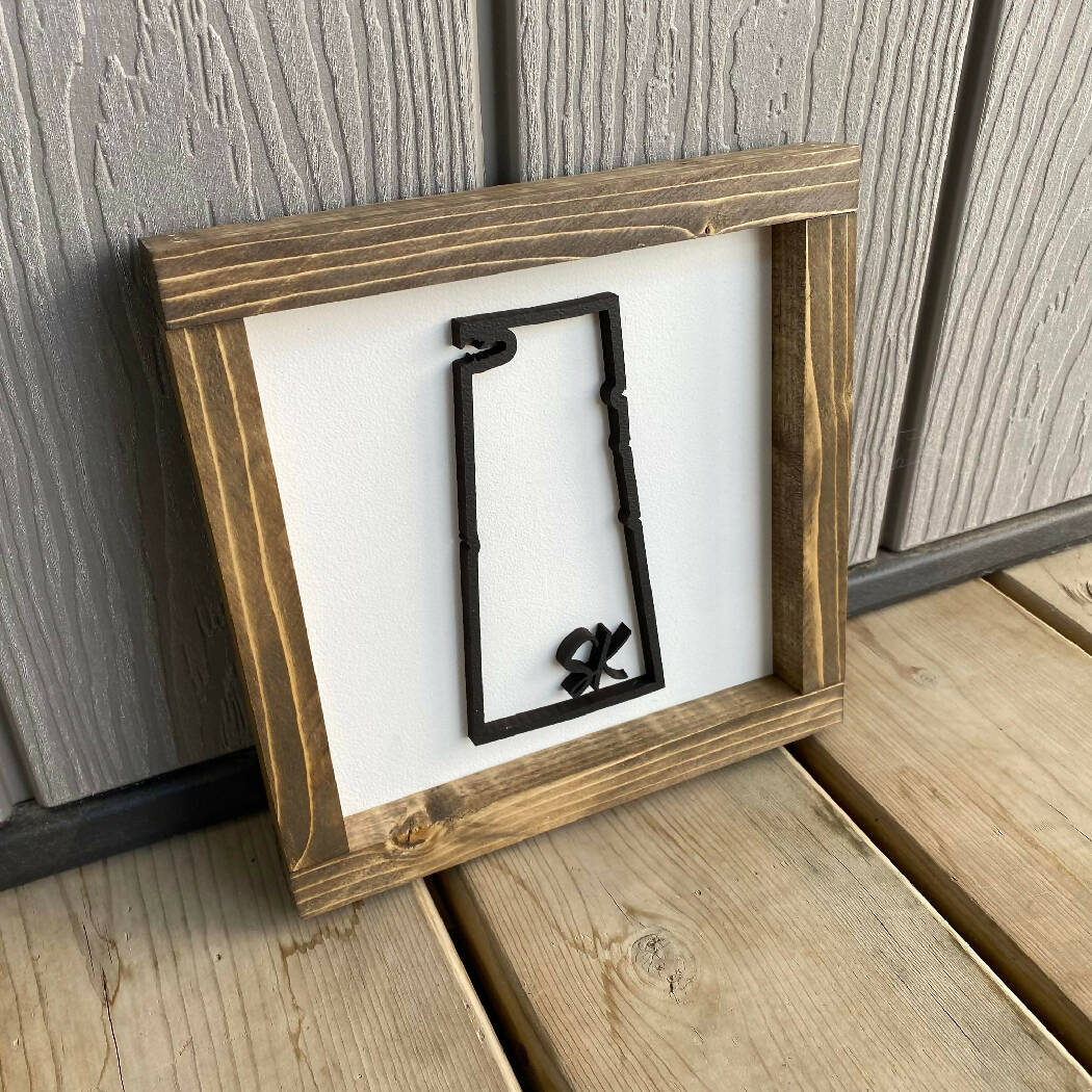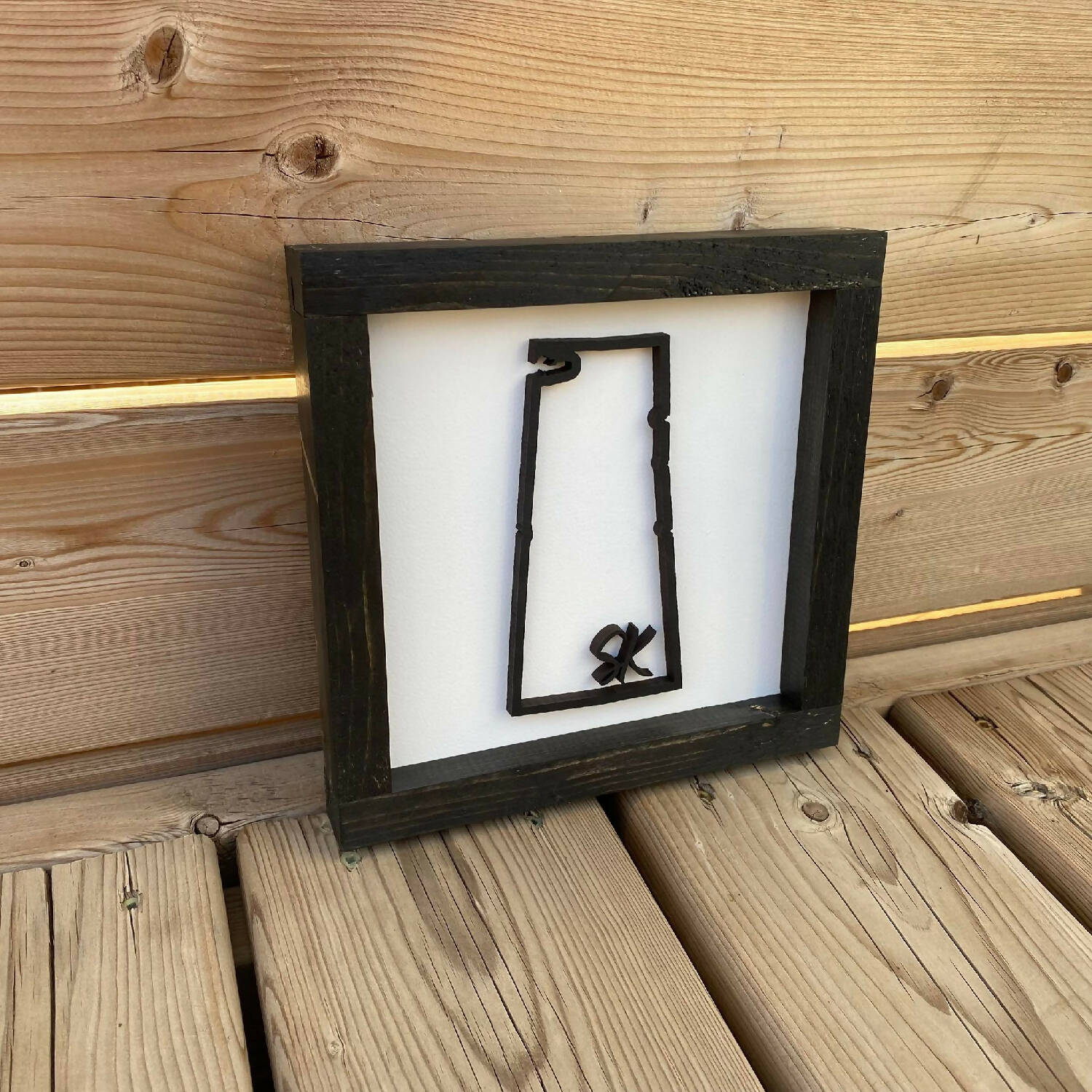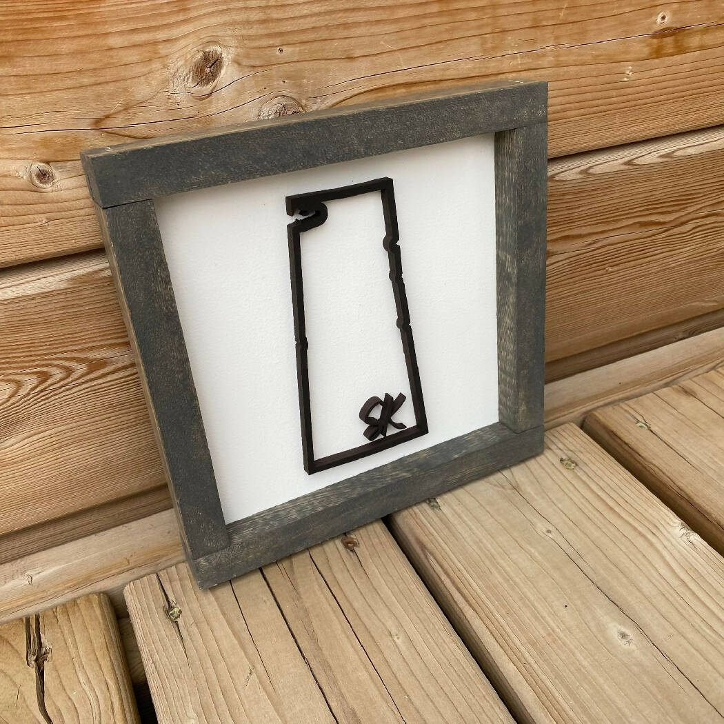 White background with black lettering. 3D lettering made from a matte black acrylic.Includes a sawtooth hanger attached to the back