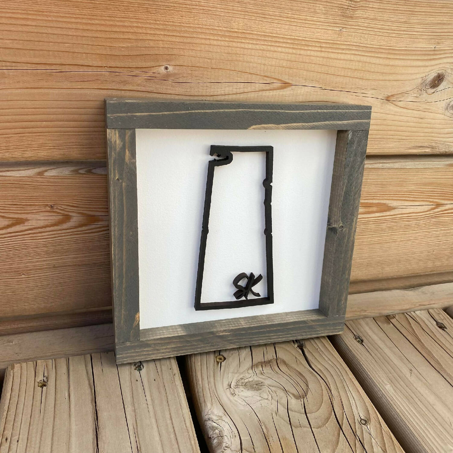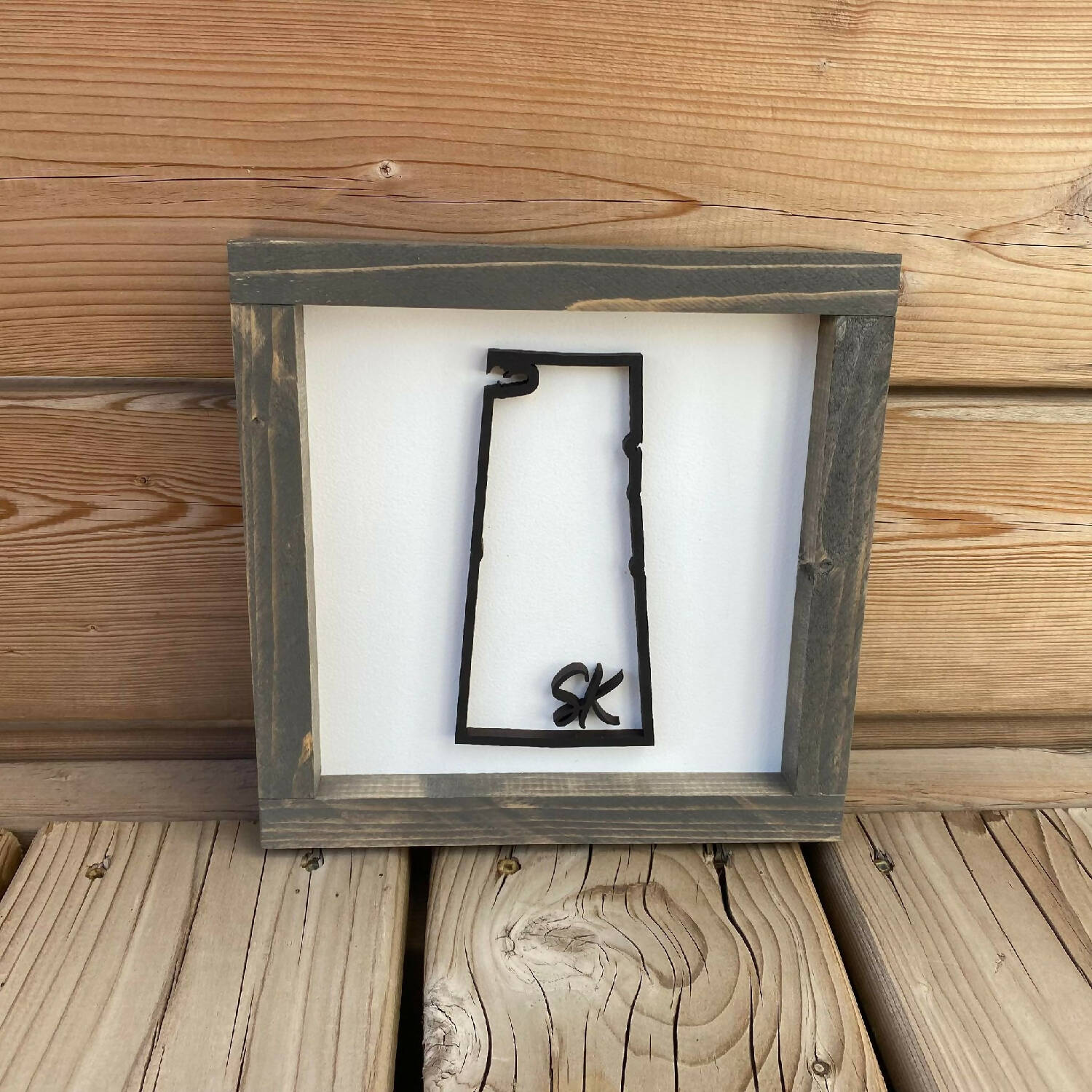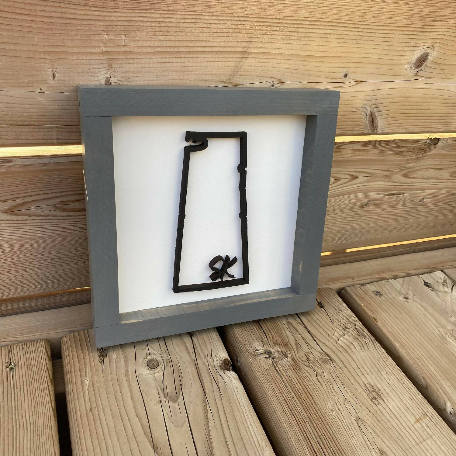 White background with black lettering. 3D lettering made from a matte black acrylic.Includes a sawtooth hanger attached to the back