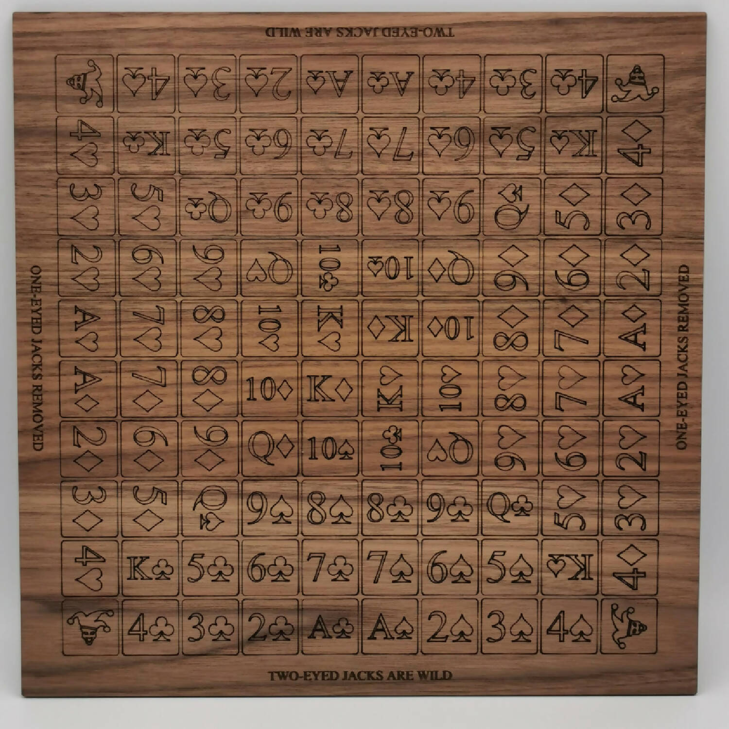 This wood sequence board will elevate your favorite family board game! Our sequence board is precision laser cut from veneered walnut or maple, and has a durable lacquer finish. The board measures approximately 13.5" x 13.5" and is 1/4" thick. Included are two decks of our luxury black playing cards, and 150 plastic markers in sleek black velvet bags. Walnut is pictured, maple is also available (light wood).