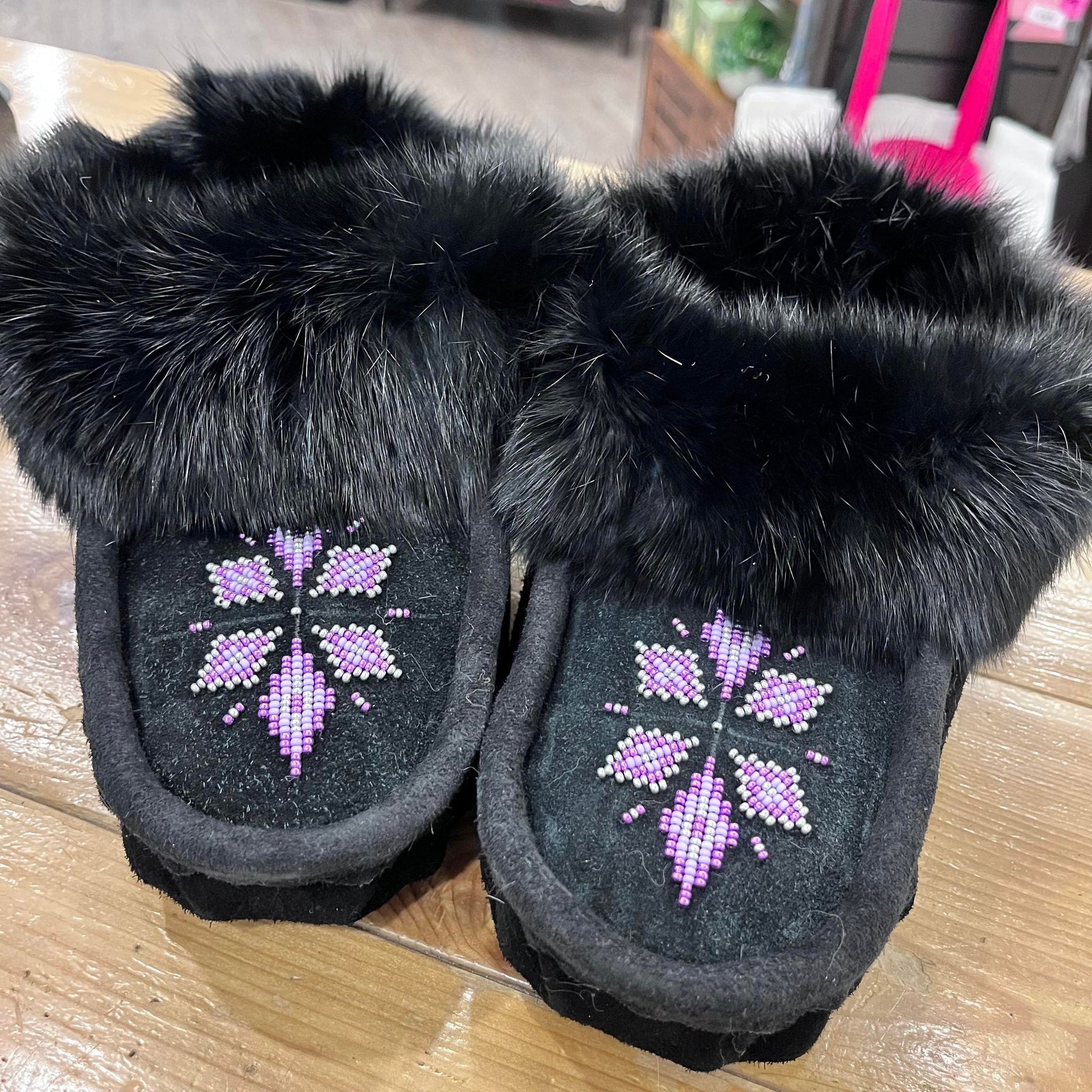 Moccasins made from genuine leather and lined with sherpa inside and a rabbit fur cuff.