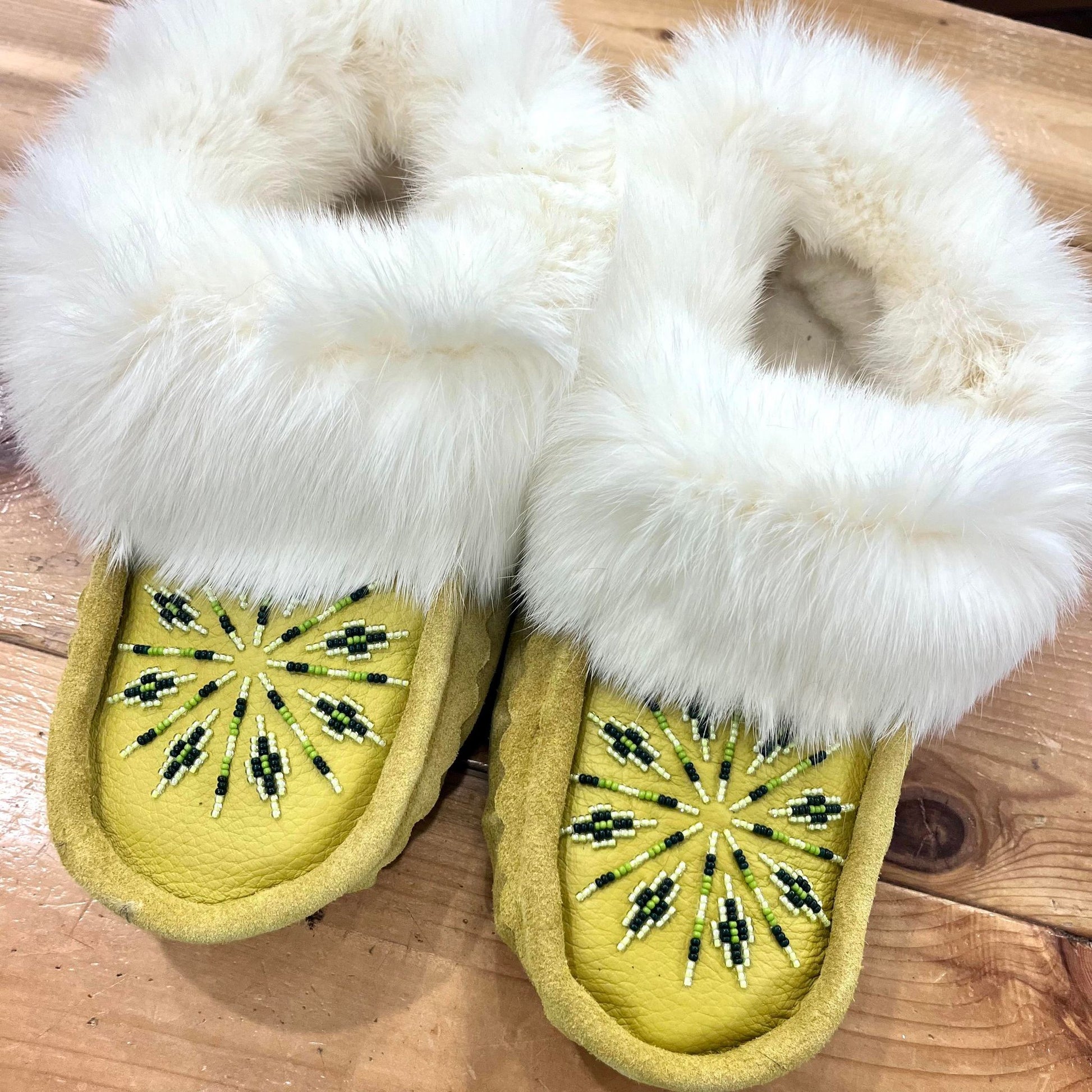 Moccasins made from genuine leather and lined with sherpa inside and a rabbit fur cuff.