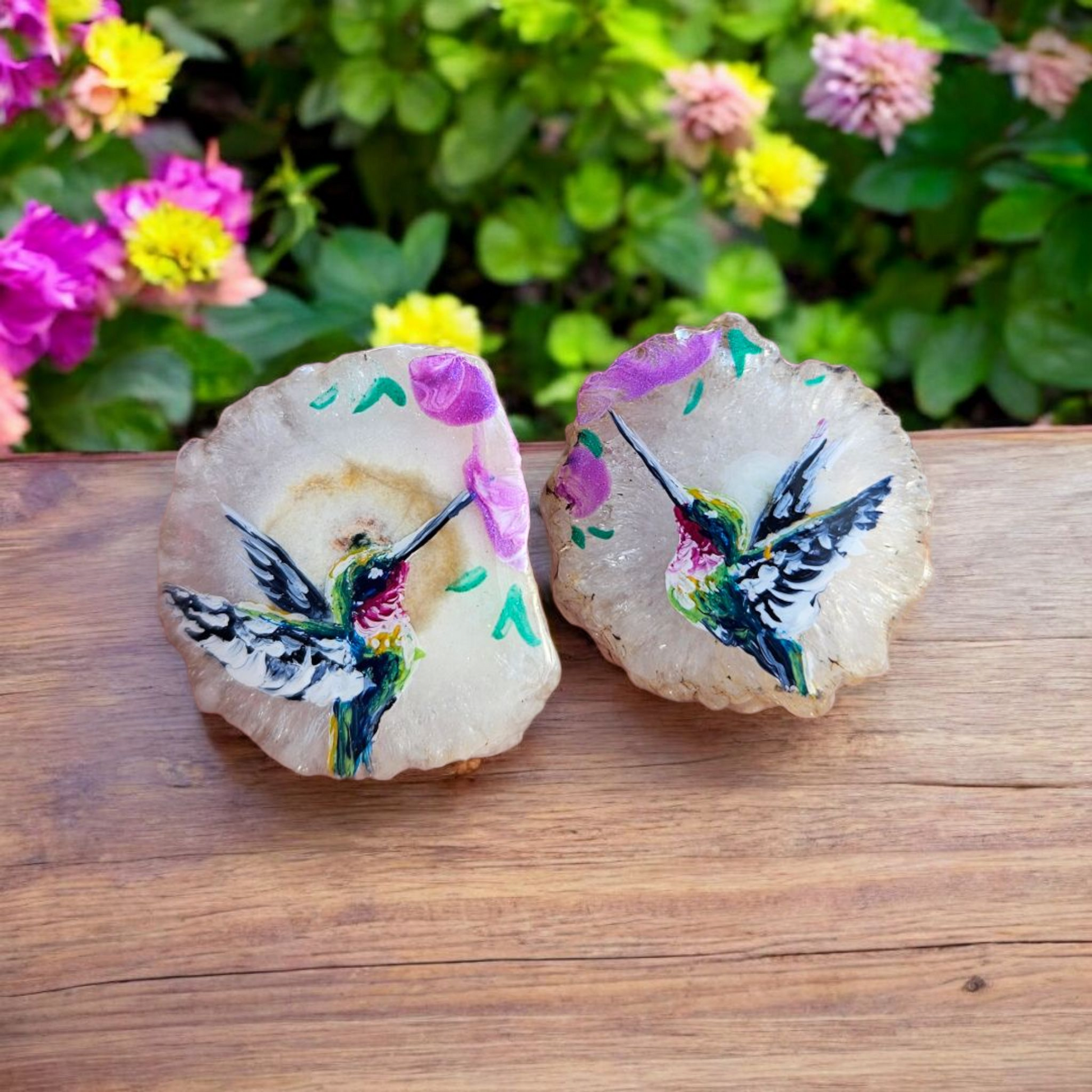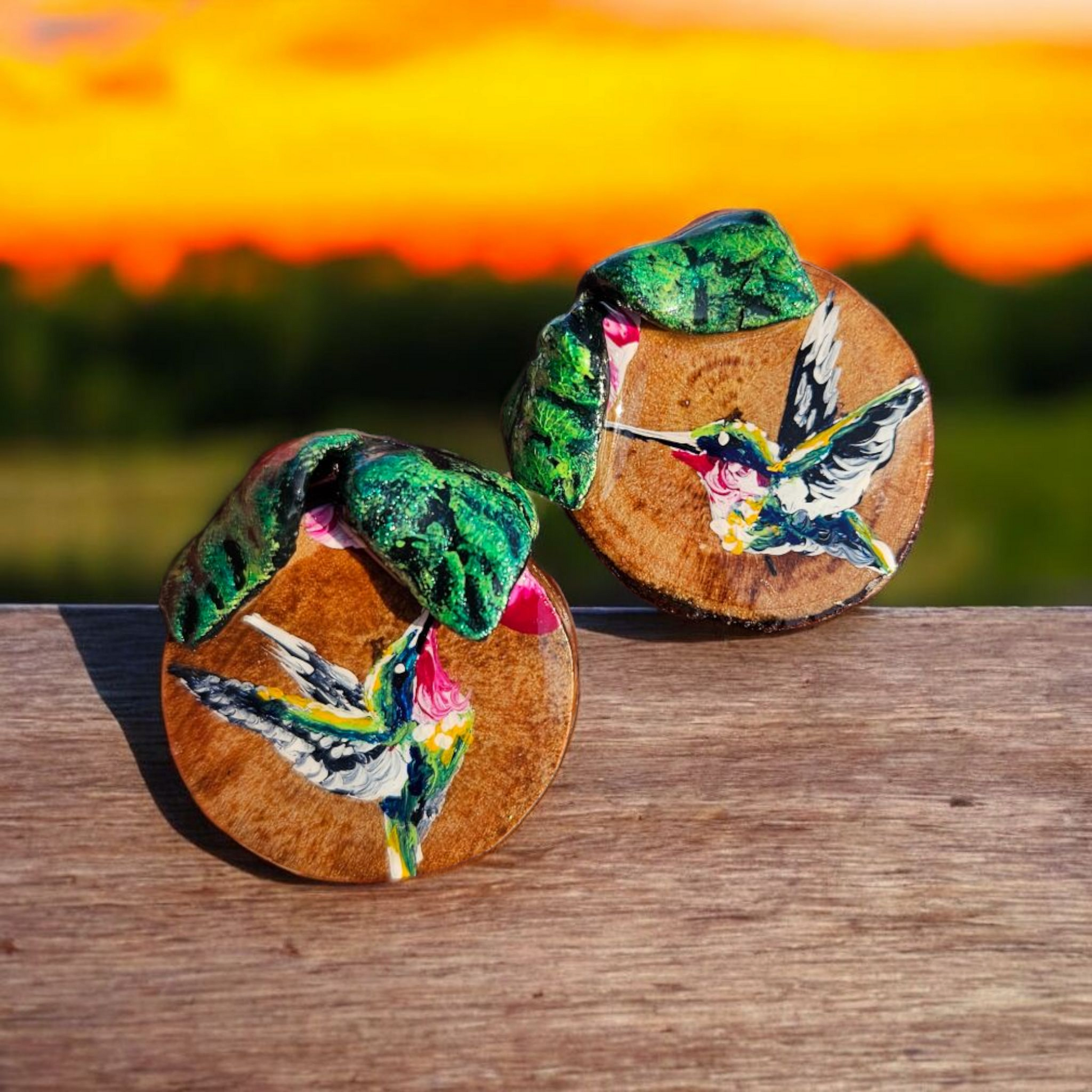 These stud earrings are hand painted on wood beads and crystal slabs approximately .75" diameter.