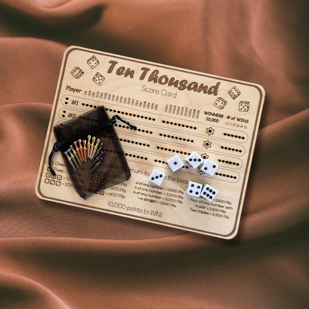 This Ten Thousand Dice Game board is a fantastic way to enjoy a classic dice game with family and friends. With a handcrafted basswood board, sturdy metal pegs, and high-quality dice, it’s a perfect gift or addition to your game collection.