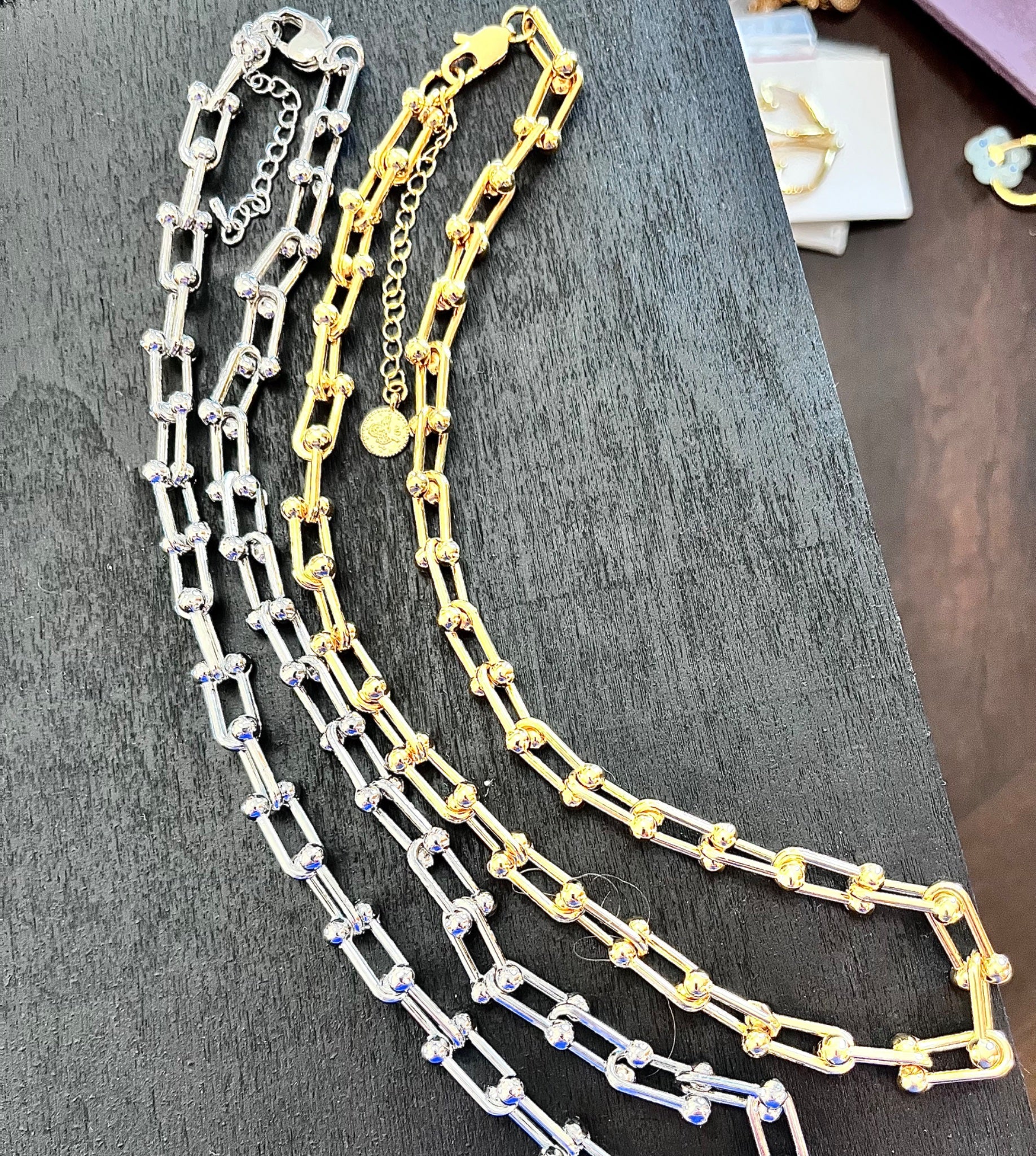 Stunning Alternating U-Shaped Ball Link Chains crafted Gold Plate or Rhodium. These Stunning statement chains have a 2.5 inch adjustable extender so you can hook the clasp on and dress it to any style. The link chain necklace comes with shining surface, very nice finish, classy looking, substantial but light weight comfortably for daily wear.
