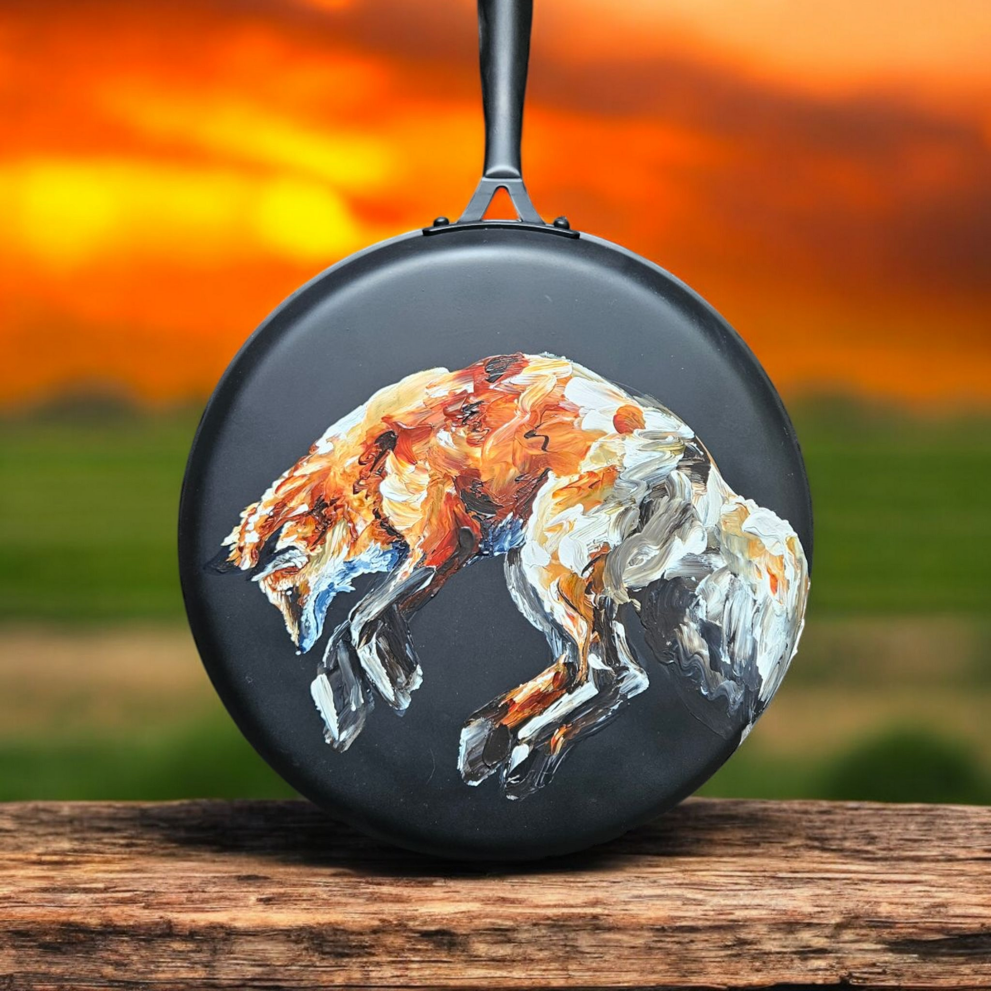 Paintings on upcycled pots and pans in a variety of sizes.