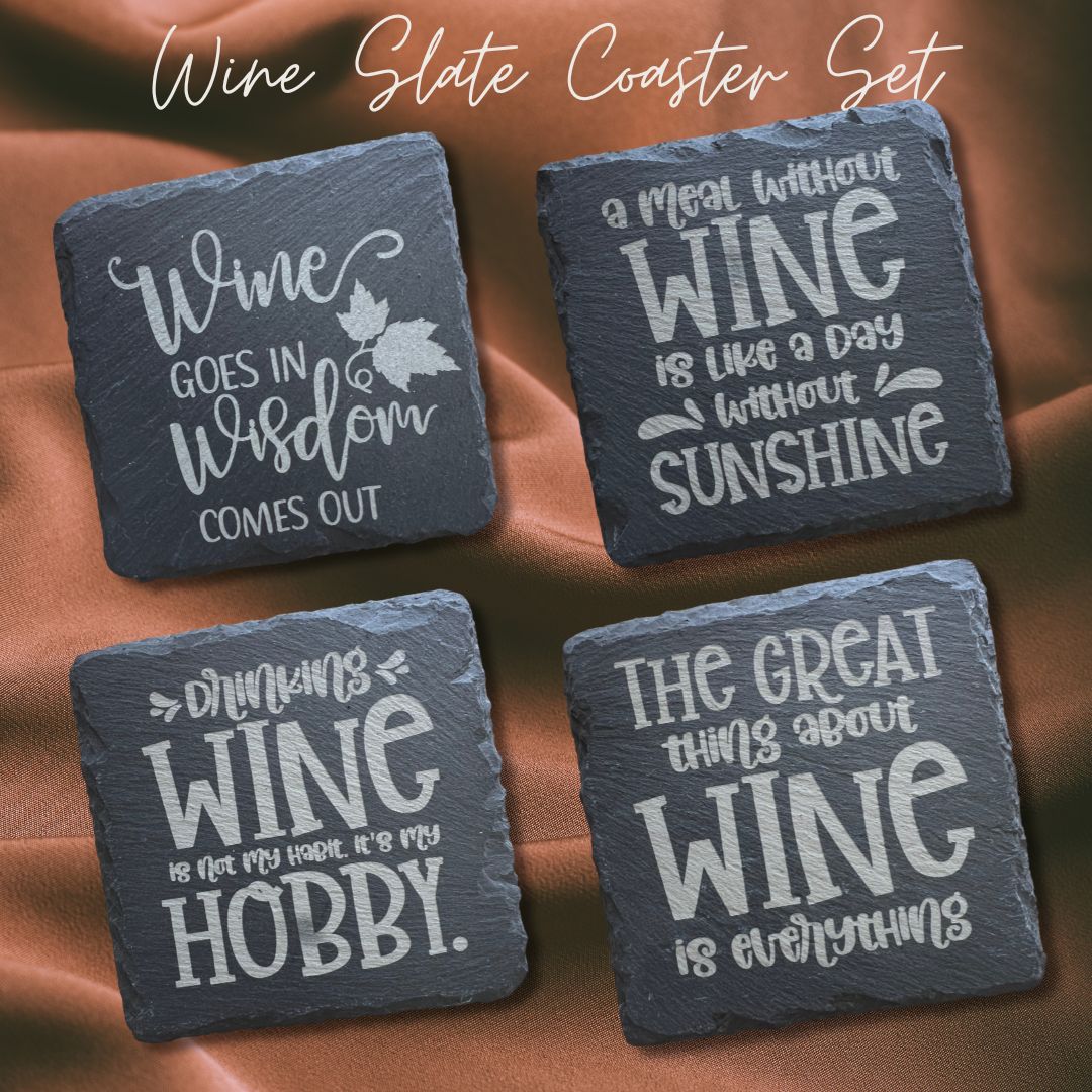 Protect your surfaces with these wine themed 4x4 slate coasters. Durable and sleek, they add a natural touch to your home while absorbing moisture to keep your furniture safe. Perfect for everyday use or as a thoughtful gift.